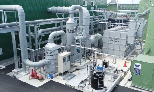 受入棟や水処理棟には、施設内で発生する悪臭物質を薬品で中和し、臭気を抑える脱臭装置を完備。酸洗浄・アルカリ洗浄・活性炭脱臭を行います。